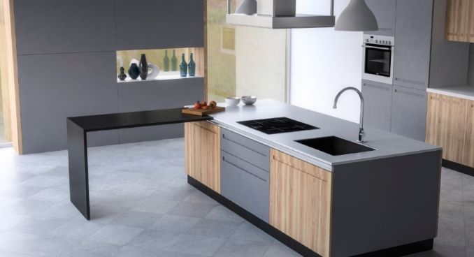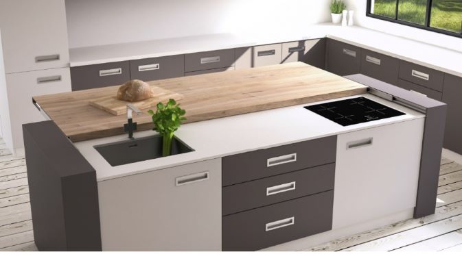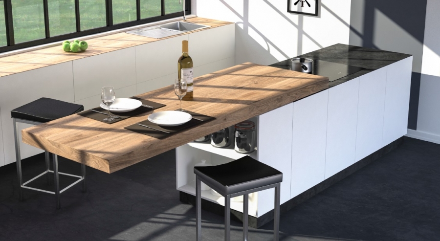 Cette solution originale et audacieuse transforme une cuisine d’un simple geste en combinant la fonction et le design. Optimisez le plan de travail de la cuisine sans toutefois monopoliser toute l’espace!