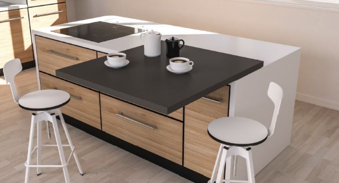 En effet, les ensembles de coulisses permettent de déplacer un comptoir mobile au-dessus d’un comptoir fixe de cuisine. Ce faisant, la surface coulissante permet d’ajouter une surface de travail additionnelle, telle qu’un comptoir-lunch, tout en gardant l’accès libre à la partie fixe du meuble.